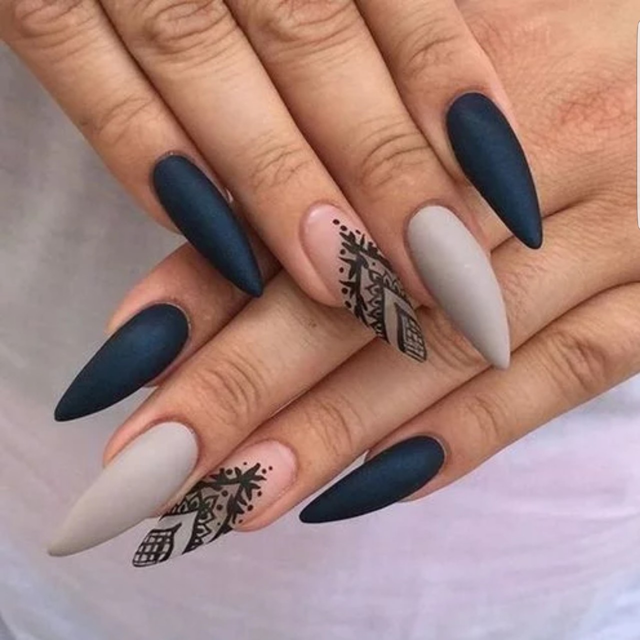 Uñas de stilletto con diseño de color azul y tatuaje de henna