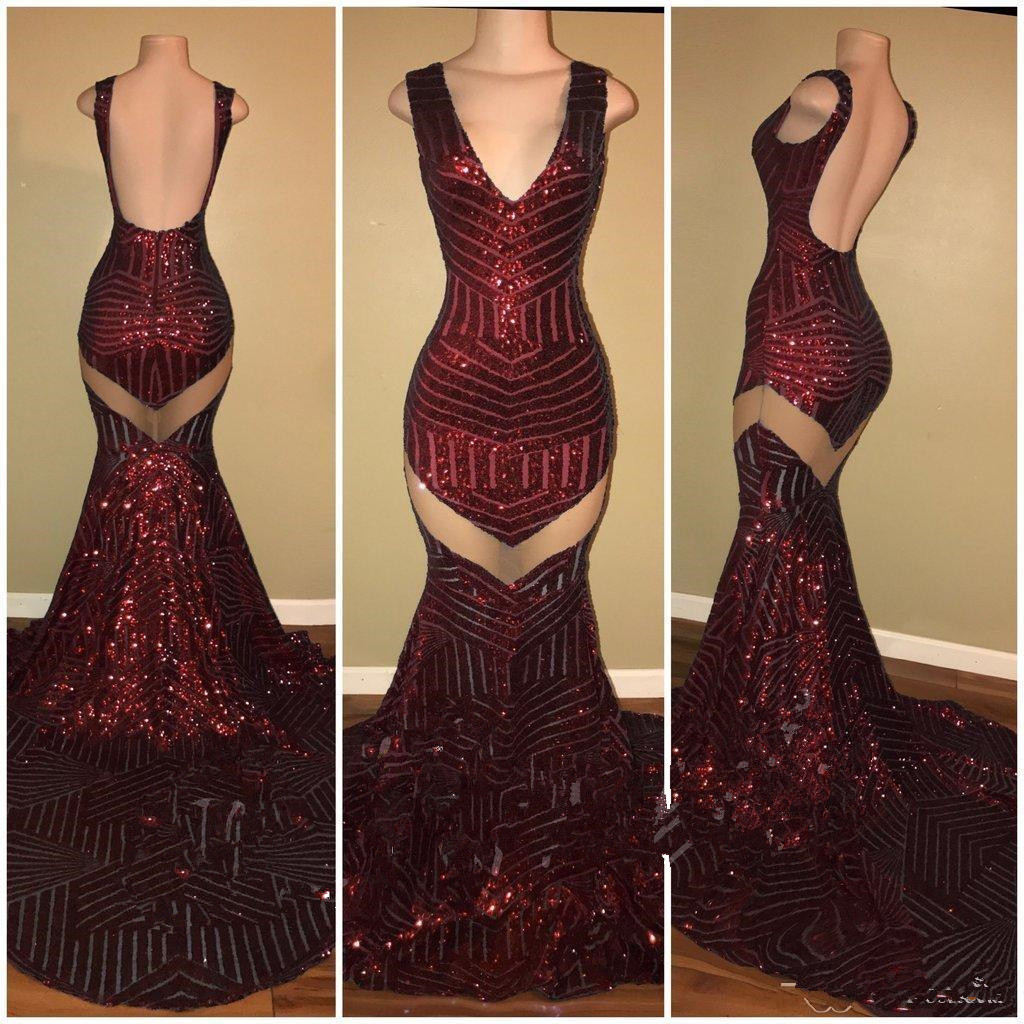 V Neck Backless Burgundy Sequin Prom Dress